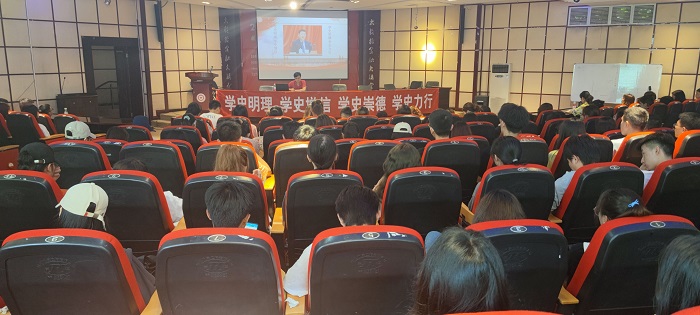 王治航从新民主主义革命时期、社会主义革命和建设时期、改革开放和社会主义现代化建设新时期以及中国特色社会主义新时代四个历史时期板块,带领师生回顾了中国共产党的百年辉煌历程,生动讲述了“红船精神”“遵义会议精神”等红色精神,分析了我们党贯穿革命、建设、改革始终的“九大”宝贵经验及党在百年奋斗中做出的伟大贡献。同时还介绍了贵州经济社会发展和贵州教育以及公司建校以来在以习近平同志为核心的党中央坚强领导下和亲切关怀取得骄人的成绩。
