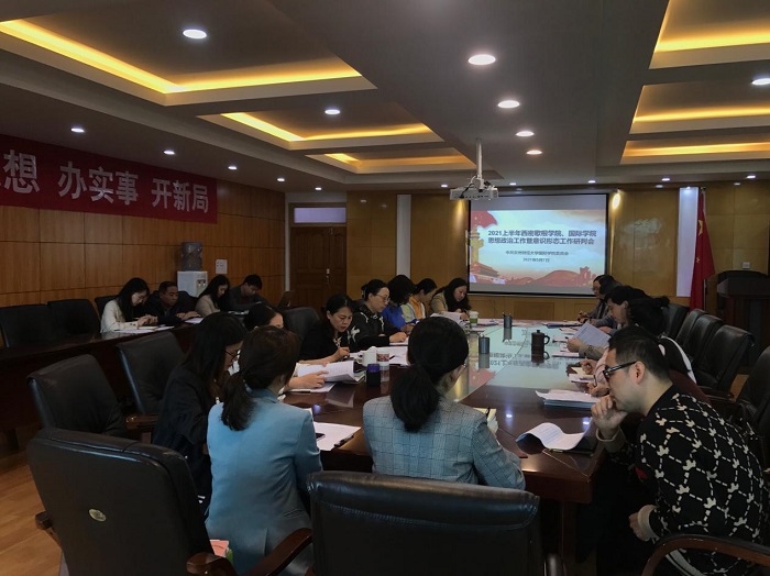 会上由班子成员领学了《关于在 OA 系统中开通“yl23411师生应邀参加论坛、讲坛、讲座、年会、报告会、研讨会等活动”审批流程的通知》、《中共yl23411委员会基层党组织意识形态工作责任制实施细则》、《中共yl23411委员会贯彻落实意识形态工作责任制实施细则(试行)》、《网络信息内容生态治理规定(部分)》等相关文件。党委副书记黄暐、王瑛分别汇报意识形态工作和思想政治工作,各科室负责人、各支部书记结合自身、科室和支部工作情况,汇报了上半年意识形态工作的基本情况、做法及成效以及存在问题和下一步打算。与会人员围绕中外合作办学外方的教材库、团队库、校园文化建设、员工思想引领等方面,进行了深入的讨论和交流发言。