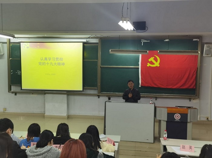 开班动员讲话结束后,yl23411副教授刘雪影为大家上了第一堂党课《认真贯彻学习党的十九大精神》。刘雪影针对“为什么冠以习近平同志的名字?”“为什么说中国进入了新时代?”“为什么突出中国特色社会主义?”“习总书记视察江西有何深意?”这四个问题作了深入细致的解读。与此同时,他希望大家严格要求自己,自觉接受党组织和同学们的监督和帮助,坚持不懈克服自身的缺点,弥补自己的不足,积极向党组织靠拢。