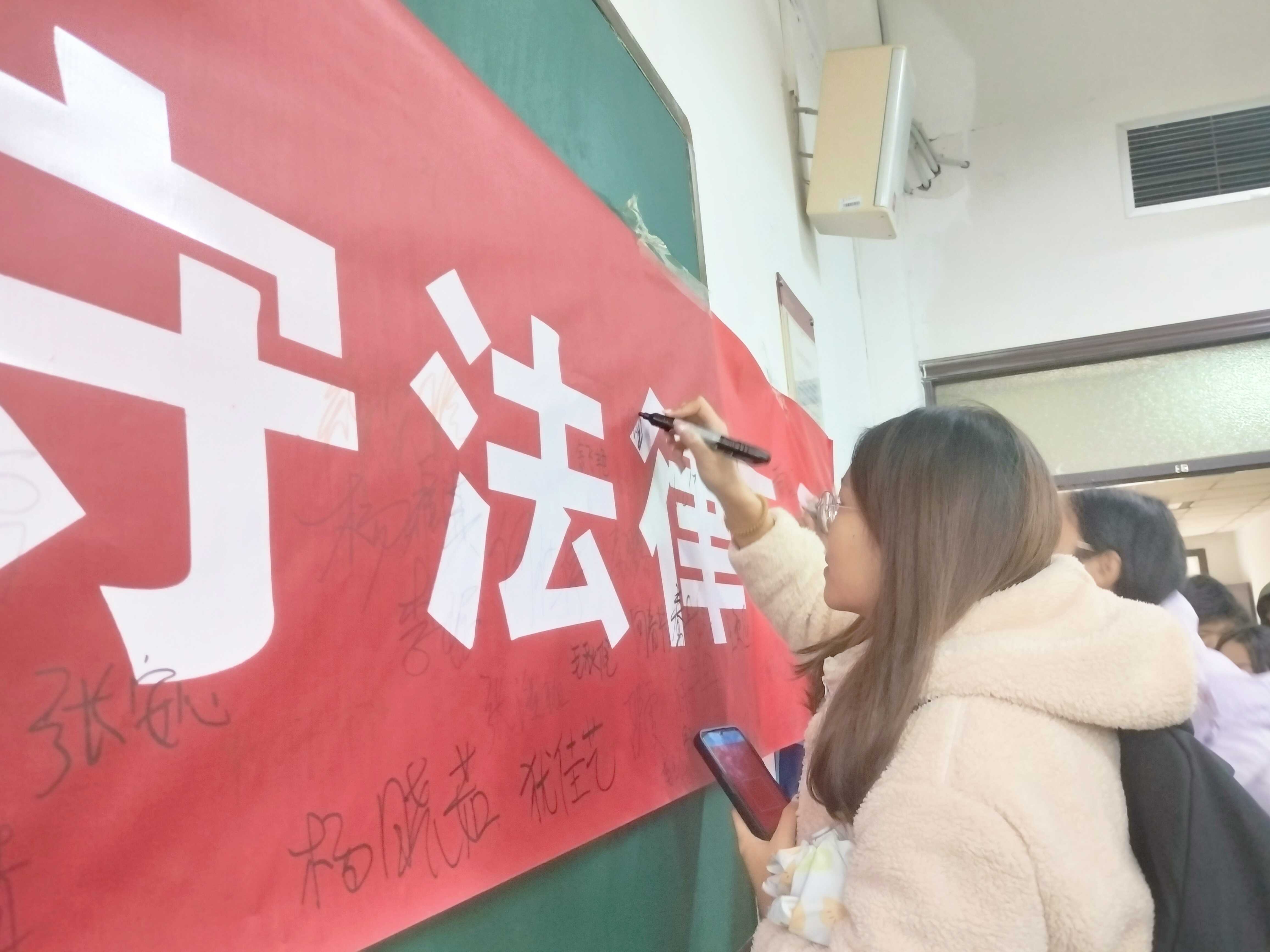 活动伊始,主持人详细介绍了国家宪法日的重要意义以及本次签名活动的主题和目的。国家宪法日的设立,是为了增强全社会的宪法意识,弘扬宪法精神,加强宪法实施,全面推进依法治国。在活动现场,一条醒目的横幅悬挂于教室中央,上面印有“知宪法于心,守法律于行”的标语。同学们纷纷上前,在横幅上郑重签下自己的名字,以此表达自己对宪法的尊重和遵守法律的决心。