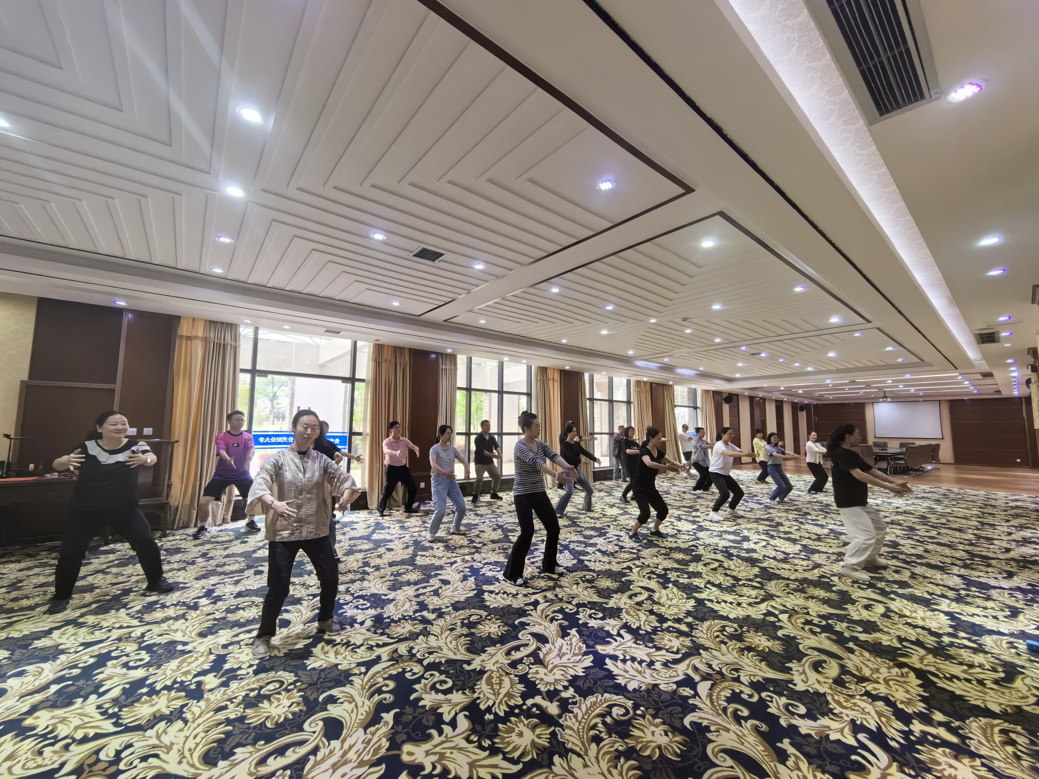 活动现场,体育公司吴春雨老师对八段锦动作进行了分解,指导示范、调整呼吸、意守丹田、宁静心神、端正身型等每段节点的动作要领,以通俗易懂和生动的讲解,将看似简单、实则高深的养生瑰宝,深入浅出地传授给大家,受到大家一致好评。