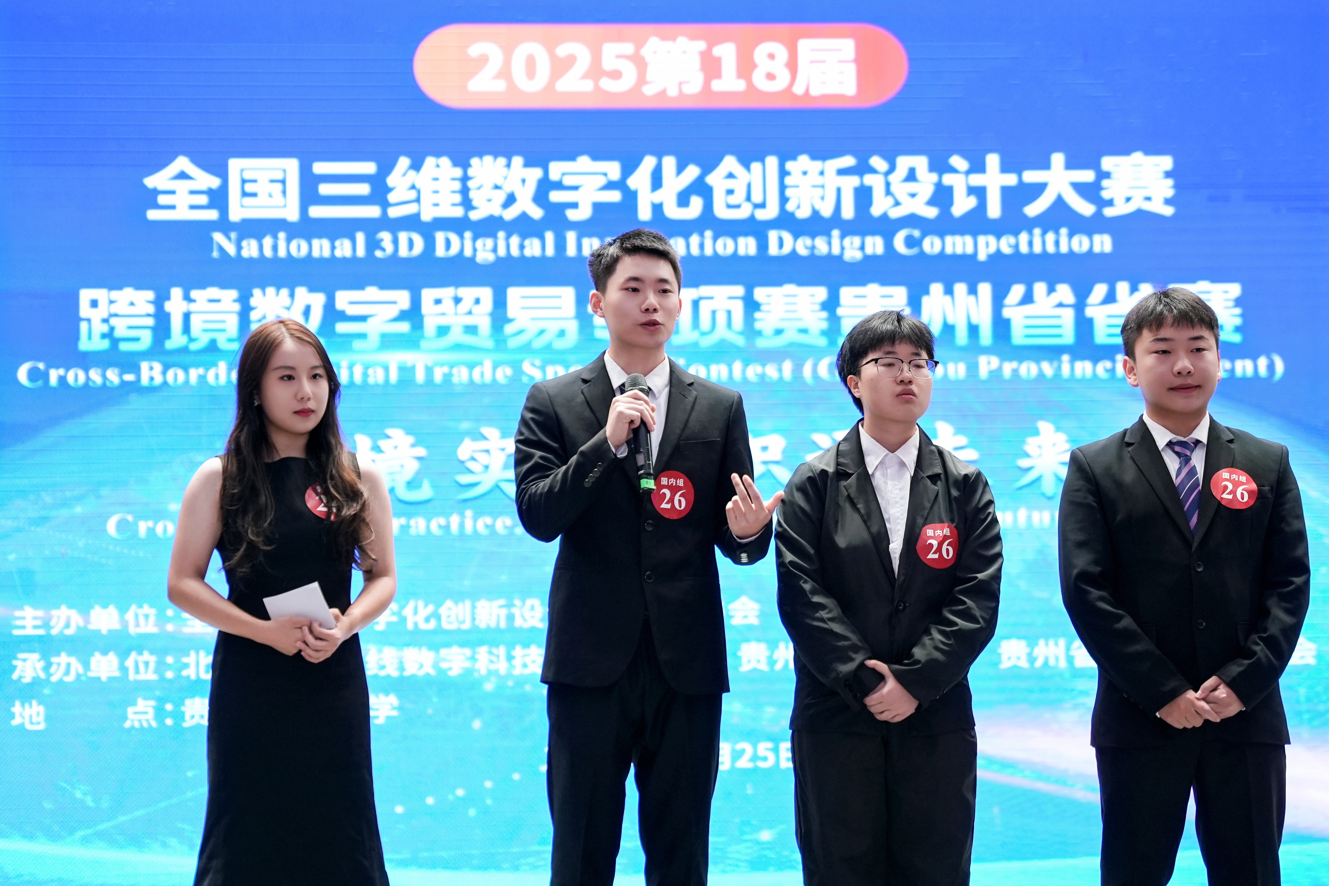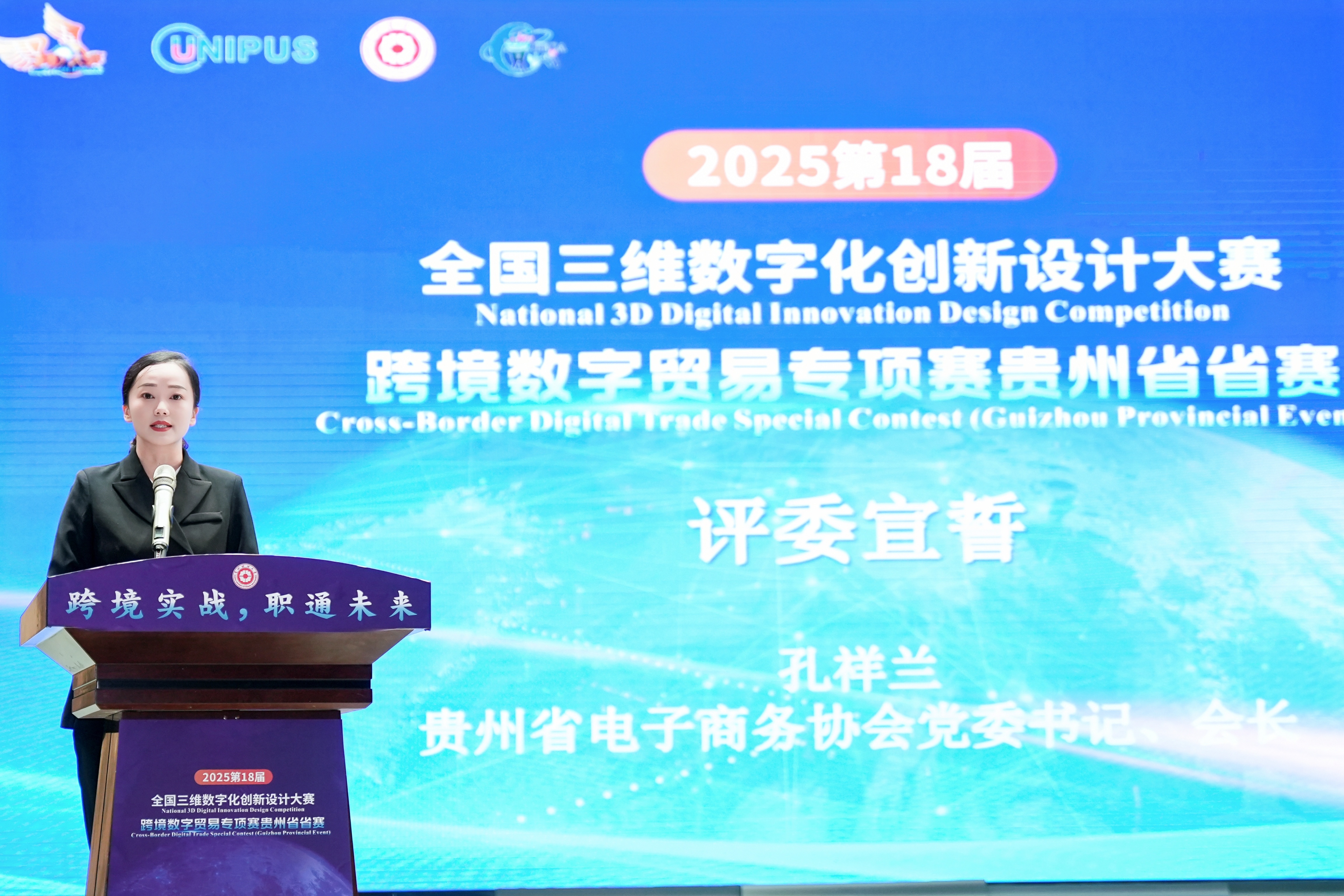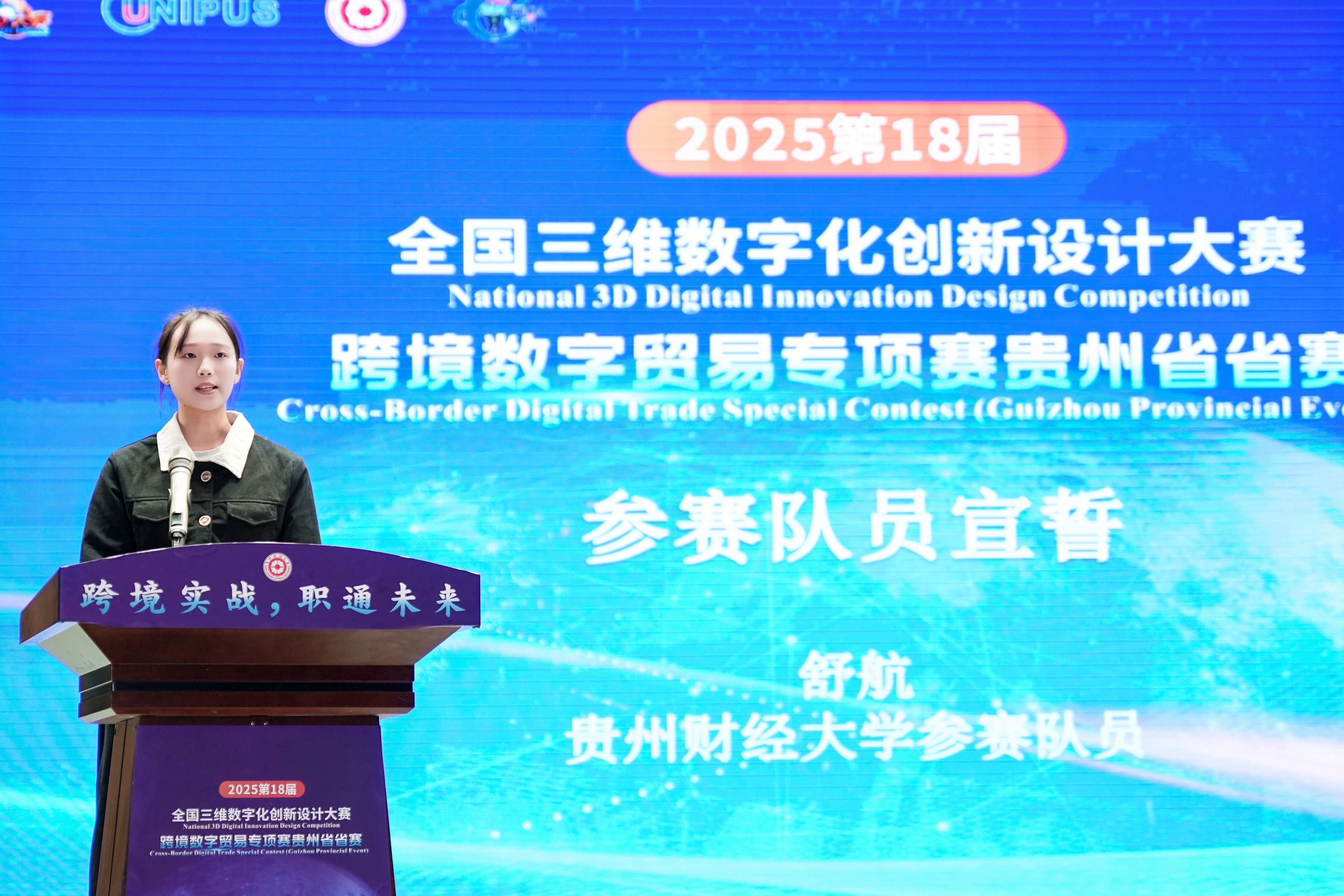 (yl23411 沙静 图文报道)10月25日,由yl23411、北京外研在线数字科技有限公司、贵州省电子商务协会共同承办的,2025第18届全国三维数字化创新设计大赛(以下简称全国3D大赛)跨境数字贸易专项赛贵州省省赛在yl23411员工活动中心举行。yl23411副董事长杜剑,对外经济贸易大学现代服务业研究中心首席教授陈进,组委会成员单位北京外研在线数字科技有限公司首席内容官兼职业教育事业部总经理徐一洁,全国三维数字化创新设计大赛组委会秘书处副主任姜宛辰,贵州电子商务职业公司副董事长邓院生,贵州省电子商务协会党委书记、会长孔祥兰等领导嘉宾以及yl23411380余名师生参加。本届专项赛省赛分初赛和复赛两个阶段,初赛吸引了来自省内13所院校,165支国内队伍和9支国际队伍报名程参加,其中,国际组的队员分别来自俄罗斯、泰国、越南等十个国家。经过评选,40支队伍入围省赛复赛路演。