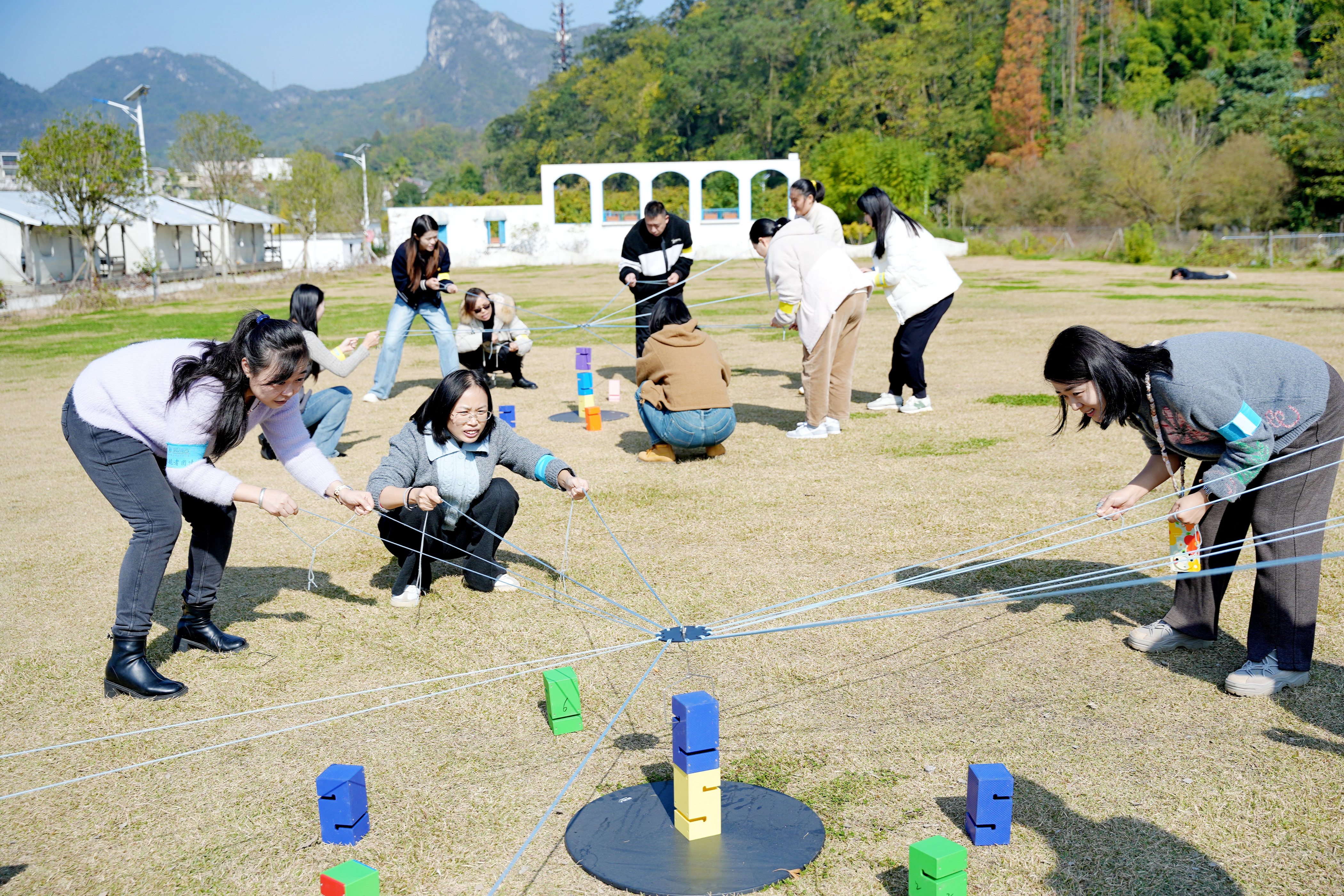 活动在 “破冰行动” 中拉开帷幕,教练通过生动讲解活动意义、组织团队组建与展示,迅速点燃现场氛围,让大家快速建立团队归属感,同时明确培训纪律、安全及环保要求。随后的 “合力筑塔” 项目中,各团队成员拉紧绳索、协同控制塔钩,精准搭建模型,在比拼速度的过程中深化协作意识;“冰壶争霸赛” 则以旱地冰壶为载体,教职工们通过策略讨论与战术配合,或精准投掷占位,或巧妙击出对方冰壶,在欢声笑语中提升团队默契,深刻体会 “团队共赢” 的意义。