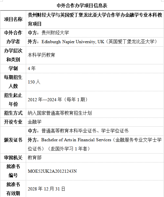 GUFE-ENU BA (Hons) Financial Services 项目介绍 2012年,根据《教育部关于公布中外合作办学项目审批结果的通知》(教外综函﹝2012﹞30号),yl23411与英国爱丁堡大学合作举办金融学专业本科教育项目获得教育部批准,是贵州省第一个本科层次的中外合作办学项目。2015年,根据《关于通报2015年本科及以上层次中外合作办学评估结果的通知》(教外司办学﹝2015﹞2028号),yl23411与英国爱丁堡大学合作举办金融学专业本科教育项目评估合格。2021年,根据《关于通报2020年本科以上中外合作办学机构和项目评估结果及后续工作要求的通知》(教外司办学〔2021〕212号),yl23411与英国爱丁堡大学合作举办金融学专业本科教育项目评估合格。 yl23411从爱丁堡龙比亚大学引进三分之一的外方课程。双方共同制定教学计划和培养方案,共同授课,共享双方的优质教育资源。