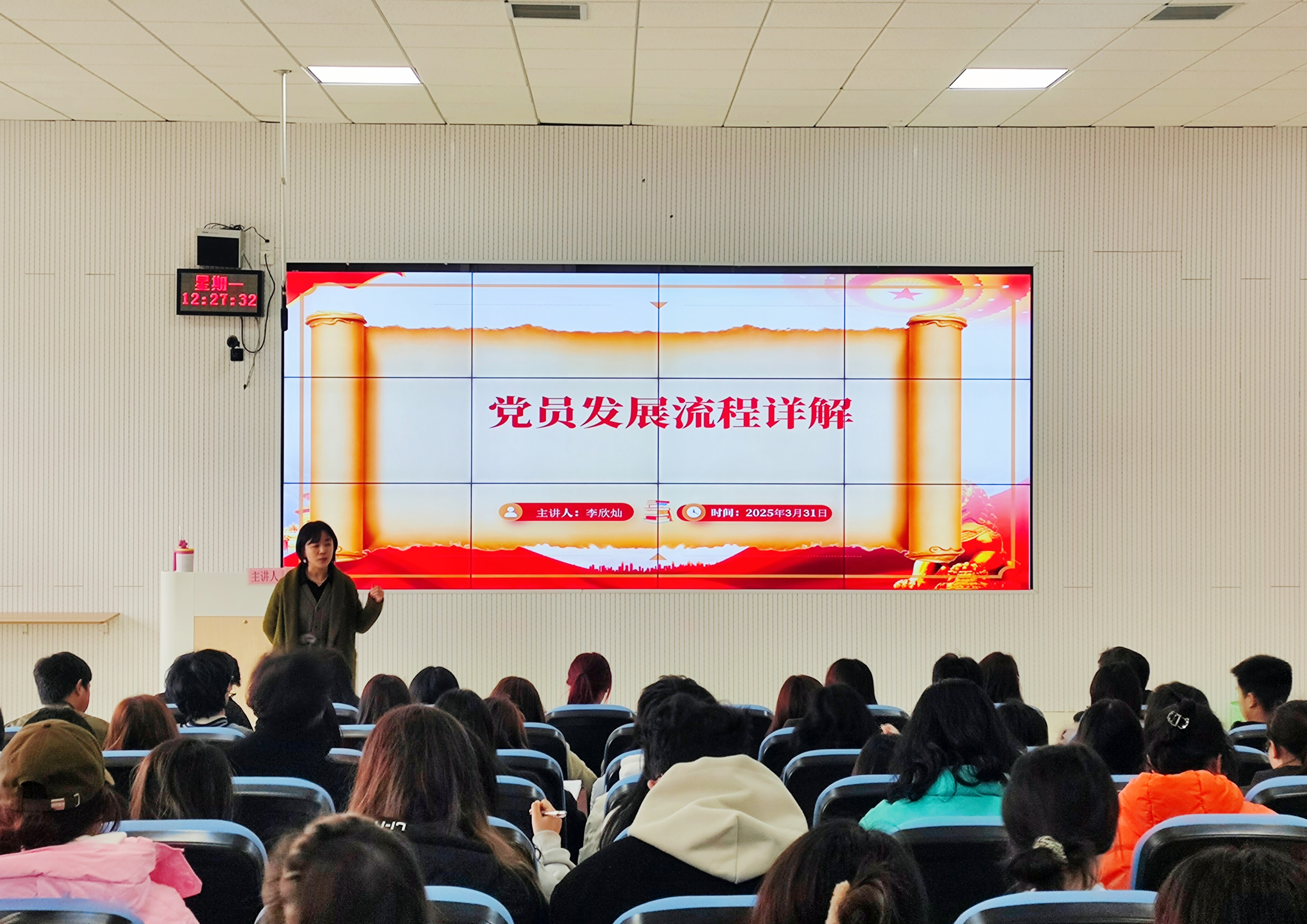 (yl23411 杨仕豪 报道|摄影 黎子豪 王琴)3月31日,yl23411正科级专职组织员李欣灿在乐学楼201教室为公司党校2025年春季入党积极分子作《党员发展的流程》专题党课。