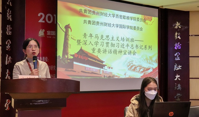 随后,尤婷婷、陈德丽、韩锦泓、陈希四位同学分别围绕“学习习近平新时代中国特色社会主义思想”“习近平总书记视察贵州重要讲话精神”“习近平总书记‘七一’重要讲话精神”“习近平总书记在党史学习教育动员大会上的重要讲话精神”四个方面进行宣讲,号召同学们树立正确的发展观与价值导向,既要学习中国传统文化的优秀精髓,也要将着眼于国际社会,学习他国先进技术文化。