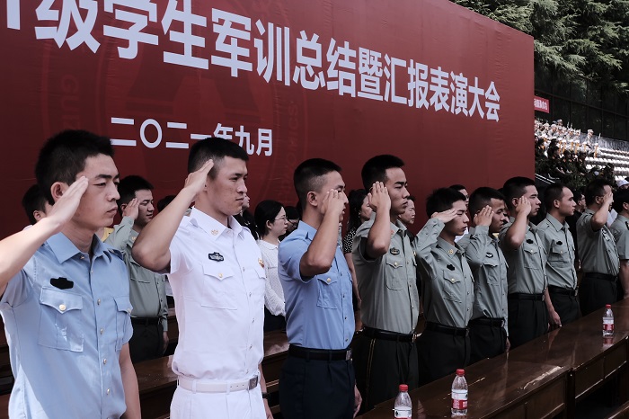 军训汇报表演在《阅兵进行曲》中开始。2021级新生组成的分列式方队步伐整齐,精神饱满,口号洪亮,气宇轩昂,依次通过主席台,接受检阅。紧接着拳术连和战术连的同学们表演精彩绝伦,青春激昂,振奋人心,赢得了阵阵热烈掌声和喝彩声,展现出贵财学子积极向上、奋发图强的精神面貌。