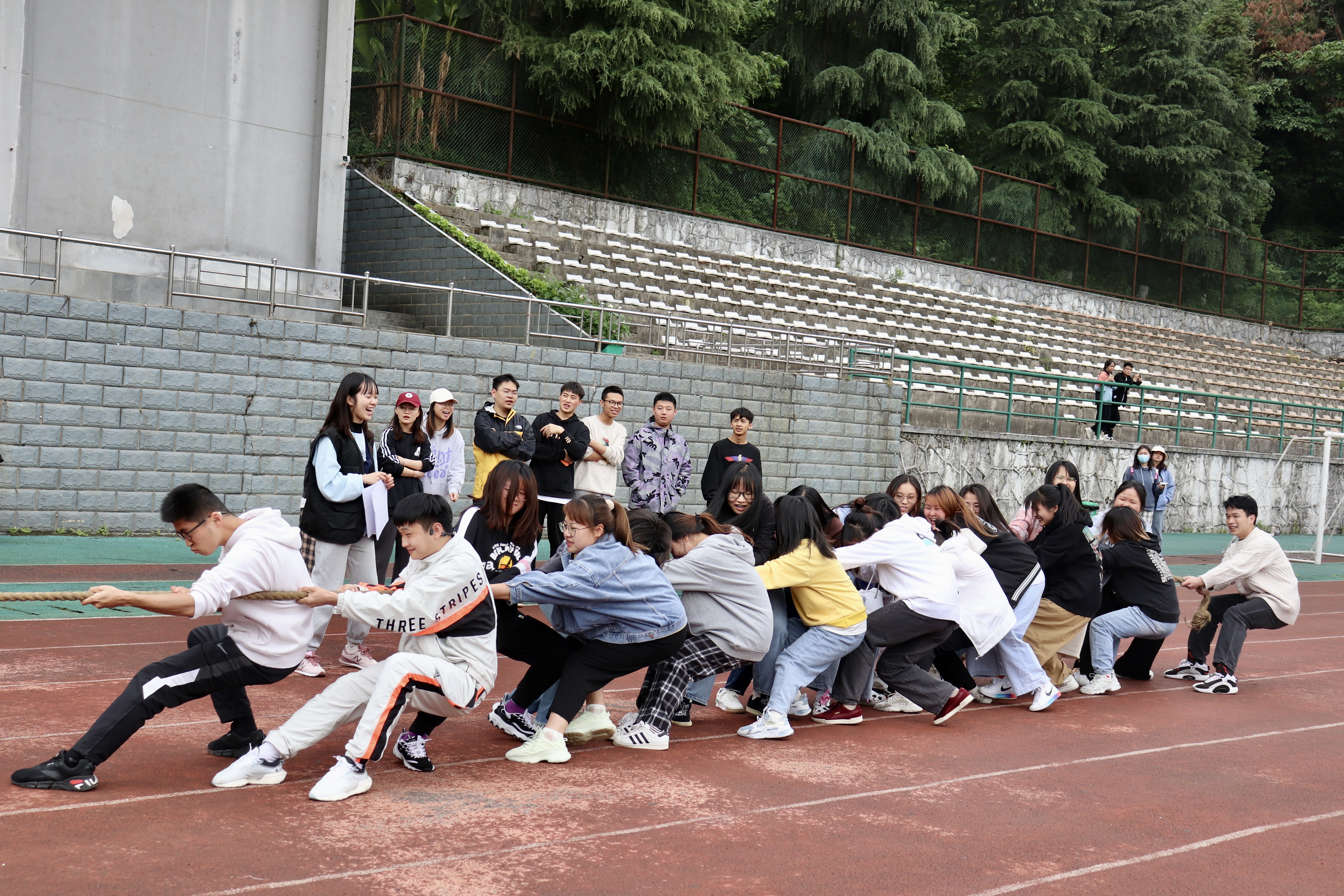当比赛的哨声响起,双方参赛的队员们紧握长绳,卯足了劲拼命往后拉。同学们在一旁呐喊助威。加油声、欢呼声此起彼伏,十分热烈。场上场下,气氛热烈。参赛选手们用汗水为我们讲述了团结的含义,他们顽强的毅力与拼搏的精神让在场的人为之感动。