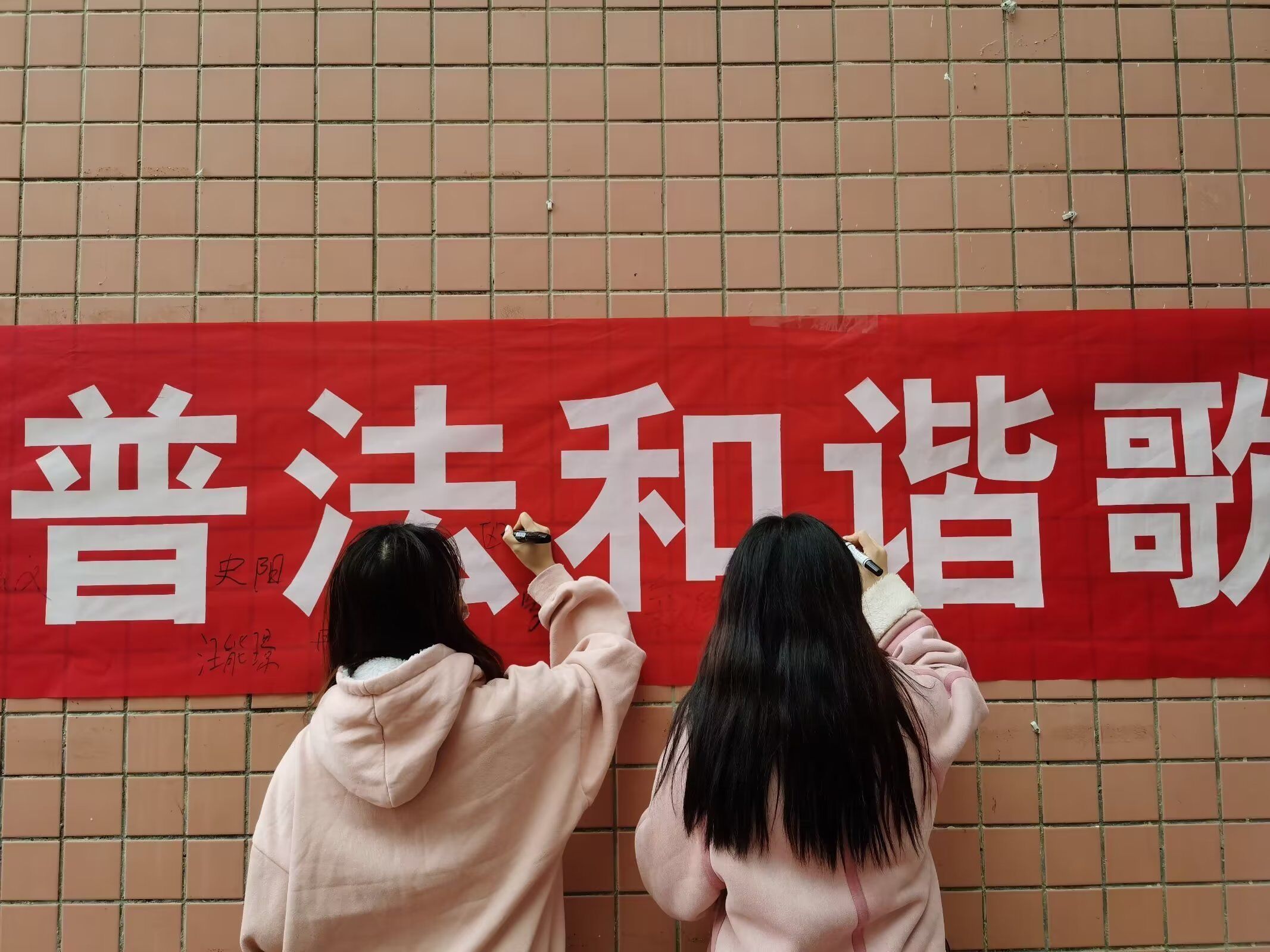 在员工部门的组织下,活动井然有序的进行。工作人员向在场的同学们宣传《中华人民共和国宪法》以及国家基本法律制度的知识,带领同学们走进宪法,学习宪法,帮助同学们运用法律知识维护自身权益,自觉培养知法、懂法、守法意识。同学们认真聆听、踊跃参与,在横幅上郑重地签下了自己名字。