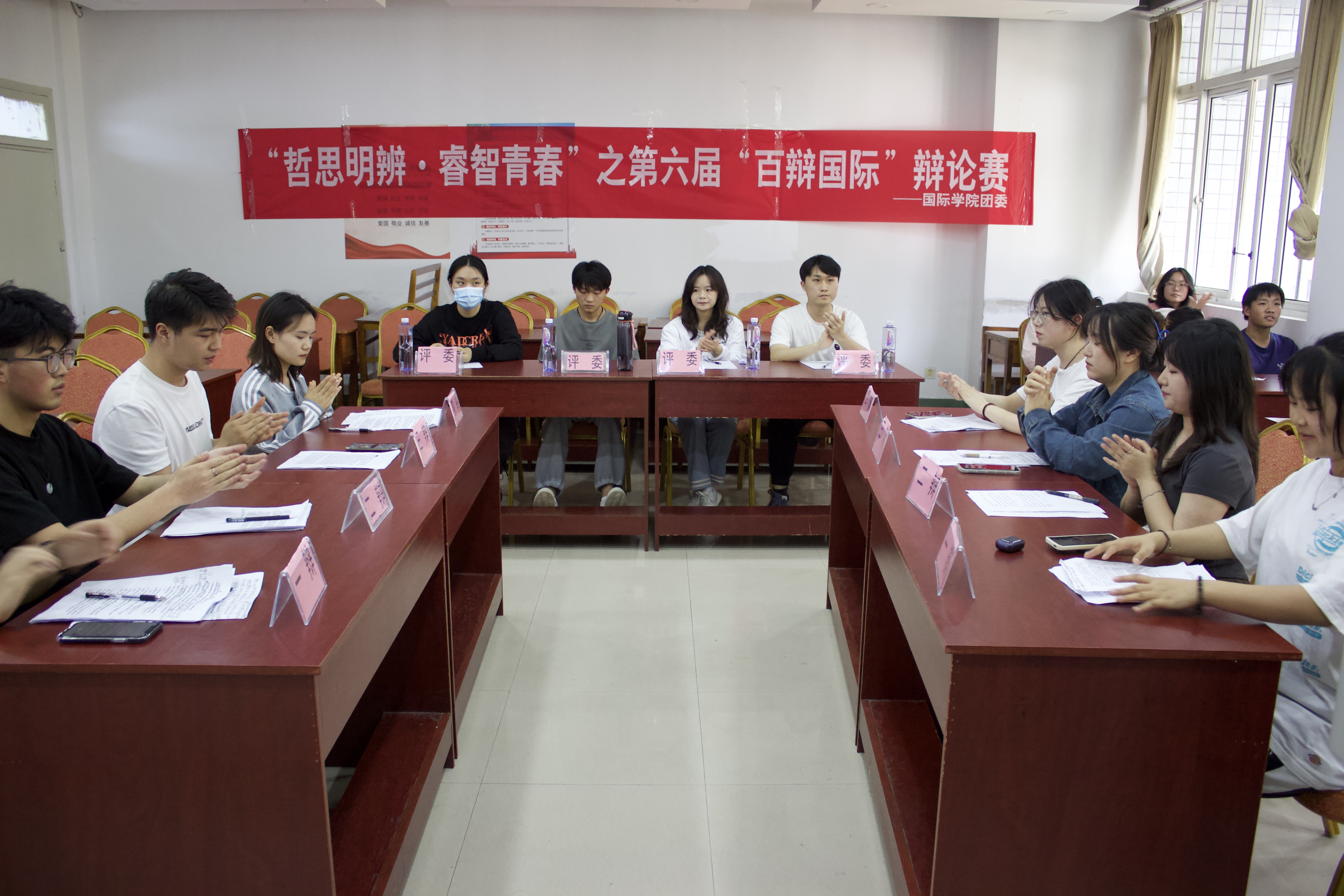 (yl23411 刘悦 报道|摄影 马星妍 李李通)为培养同学们的逻辑思考能力、语言表达能力和组织能力,激发同学们对一些社会辩题的思考,4月18日下午,yl23411在鹿冲关校区第二教学楼3-5,3-6教室举办“哲思明辩·睿智青春”第六届“百辩国际”辩论赛初赛。
