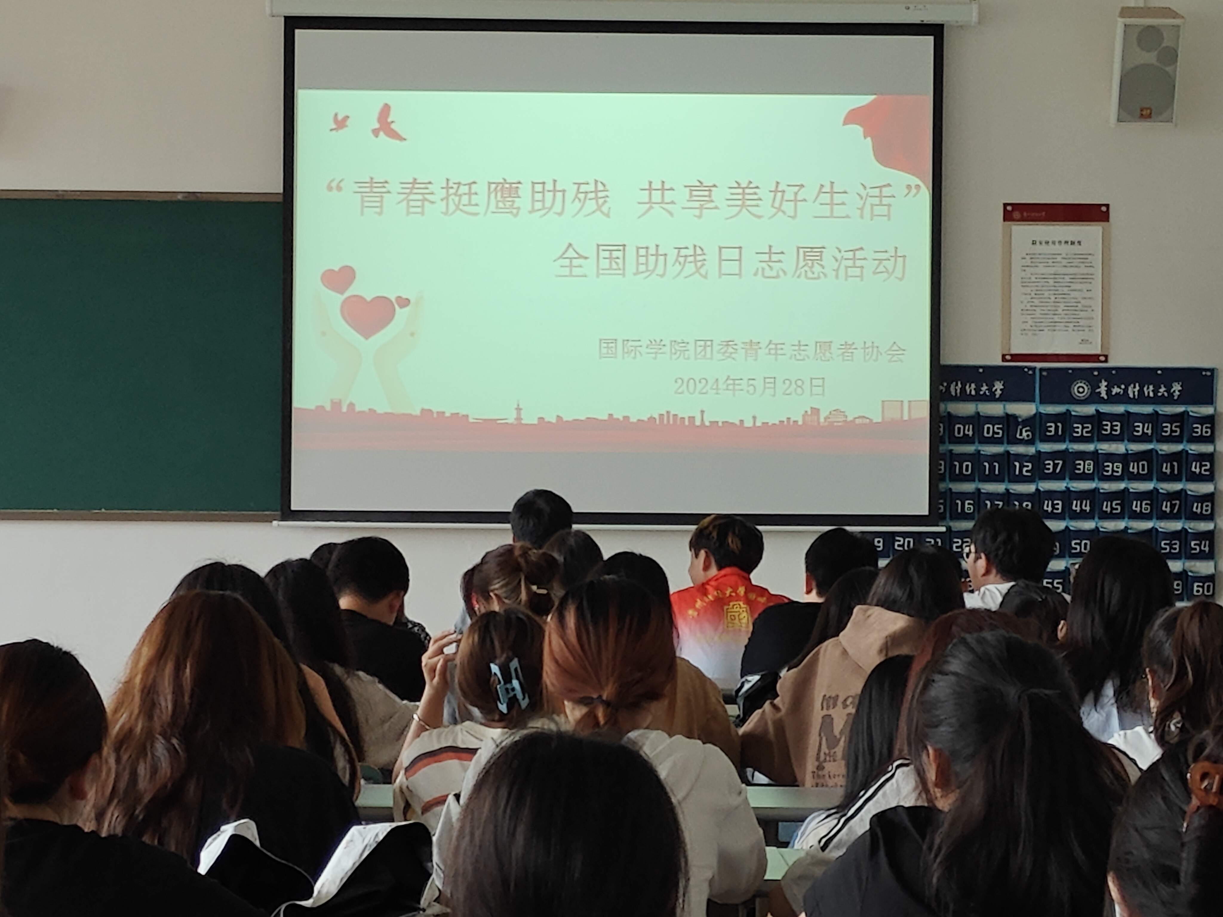 (yl23411 陈星妹 报道|摄影 吴现丽)为提高同学们对残疾人群体的关注和理解,传递助残扶弱的正能量,营造尊重、理解、关心残疾人浓厚社会氛围,5月28日,yl23411在西区博学楼4-20教室开展“青春挺鹰助残,共享美好生活”全国助残日志愿活动。