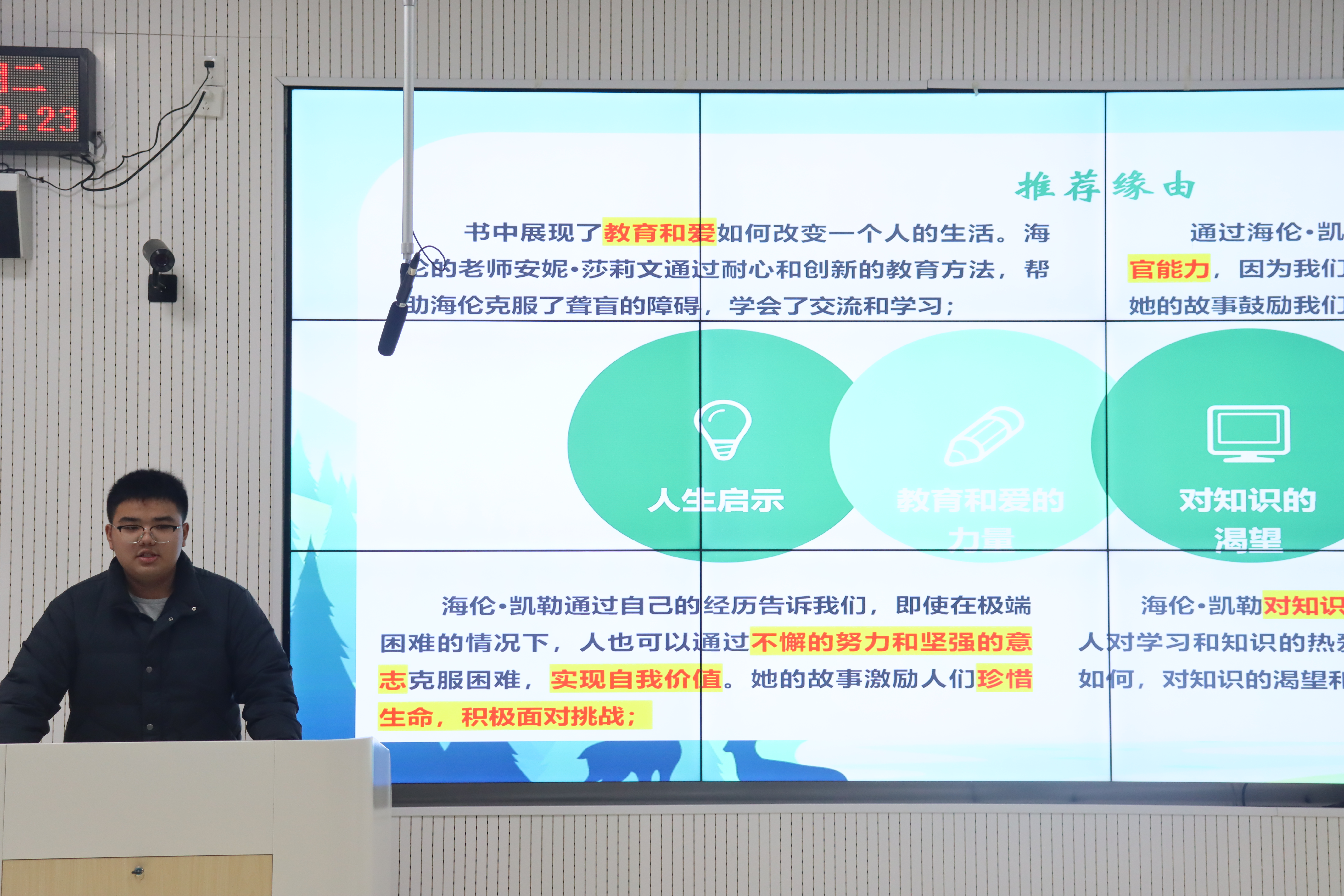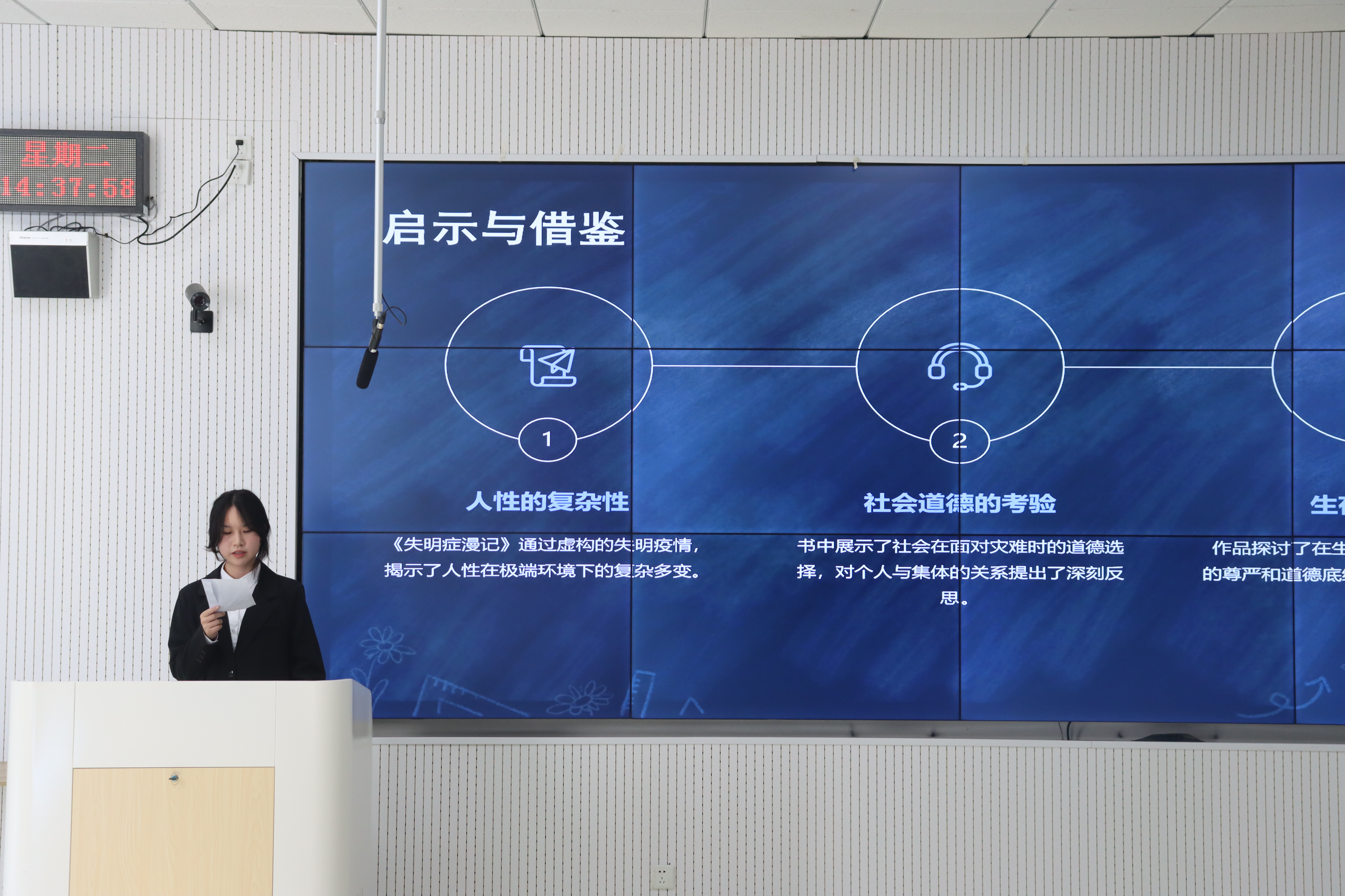 来自不同年级不同专业的同学们精心挑选了五本与盲人主题紧密相关的书籍进行分享。2023级市场营销(ISEC)专业的黄家琨同学以毕飞宇的《推拿》为引子,描绘了盲人推拿师们的生活与情感;2024级金融学(中外合作办学)专业的杨林森同学则通过海伦·凯勒的《假如给我三天光明》,传达了作者对光明的渴望与对生活的热爱;2023级会计学(ISEC)专业的王恩淇同学分享了《我是我的光明》《看不见》两本书籍,展现了盲人如何在逆境中自强不息,实现自我价值,重新发现世界的美好;2024级国际商务(ISEC)专业的秦益雷同学以若泽·萨拉马戈的《失明症漫记》收尾,揭示了人性在极端情况下的光辉与阴暗。这些分享不仅展现了书籍的深刻内涵,更激发了在场每个人对盲人群体生活状态、心理感受以及社会支持等方面的深刻思考。