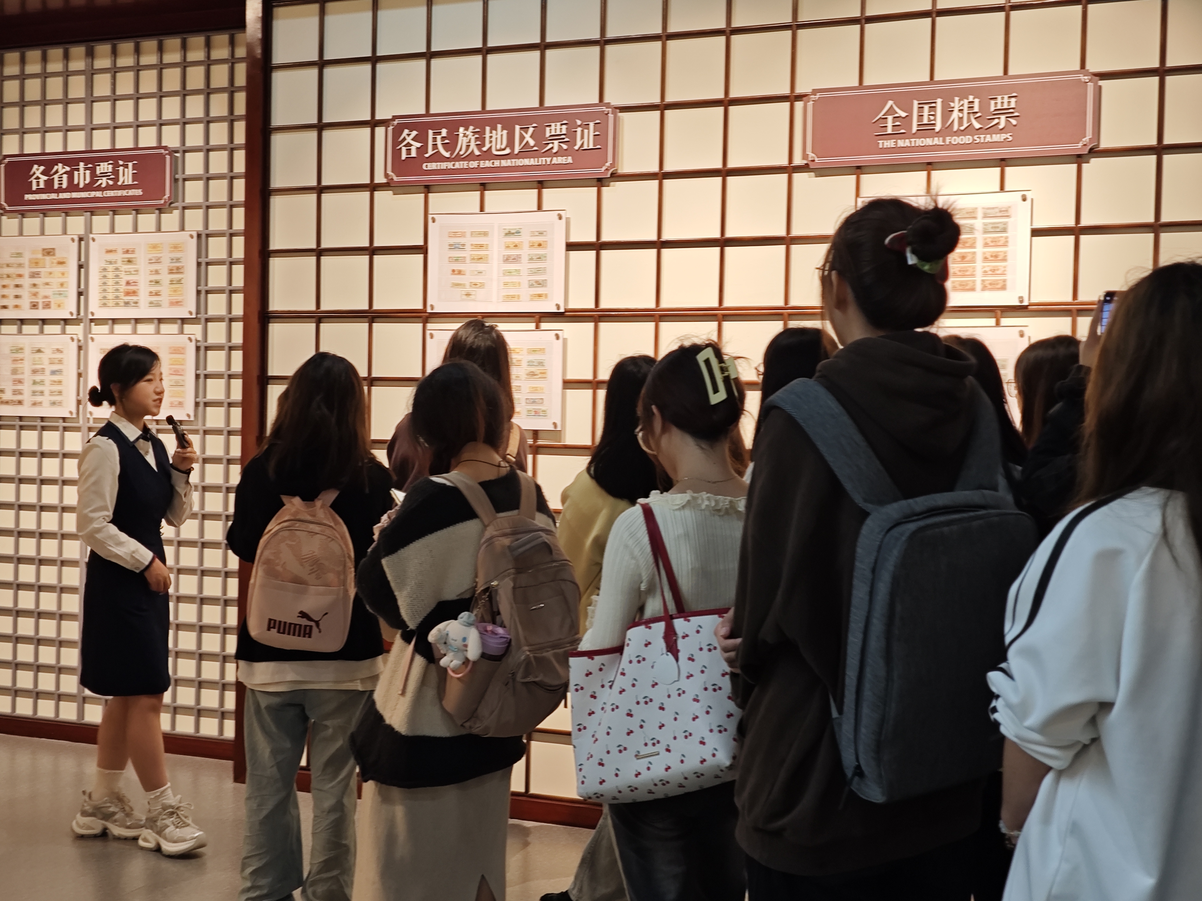 在票据馆讲解员的细致解说下,同学们井然有序地参观了各个展厅。讲解员围绕第一至五套人民币的发展变化展开,通过人民币的迭代映射出社会时代的变迁。同时,借助少数民族票据展现中华民族一家亲的理念,并通过湘赣革命根据地的红票、陕甘宁边区的银行债券等珍贵展品,让同学们深刻体会到中国共产党为人民谋幸福、为民族谋复兴的初心与使命。在票据馆,贵州相关票据的展示,进一步凸显了贵州与时代发展同步,社会经济共同进步的显著特征。