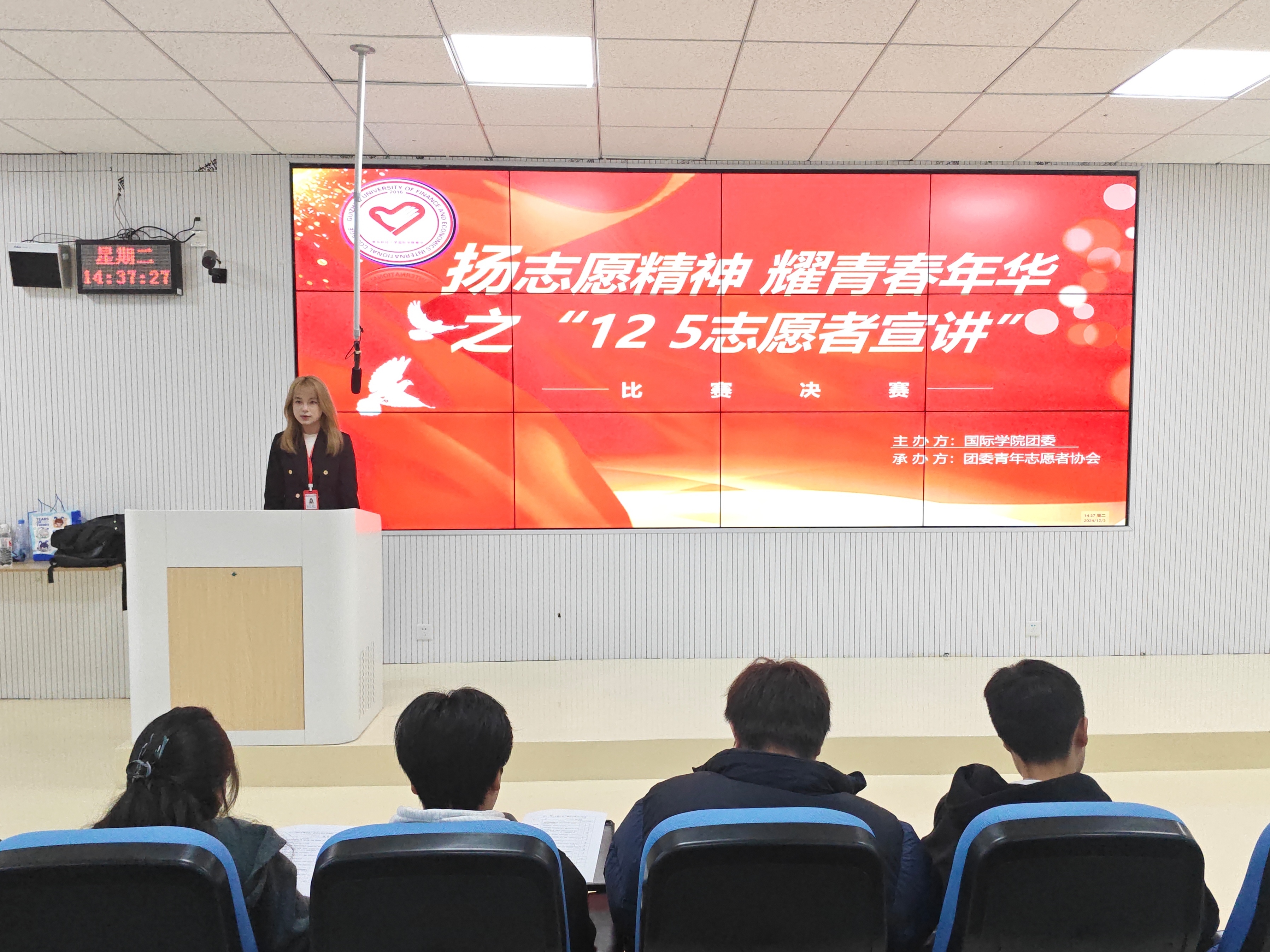 (yl23411 向美云 报道|摄影 李亭)为提高青年志愿者服务意识,普及志愿服务相关知识,营造志愿服务浓厚氛围,推动yl23411志愿服务工作走深走实,12月3日,yl23411团委、青年志愿者协会在乐学楼102教室举办“扬志愿精神,耀青春年华”之“12·5 志愿者宣讲”比赛。