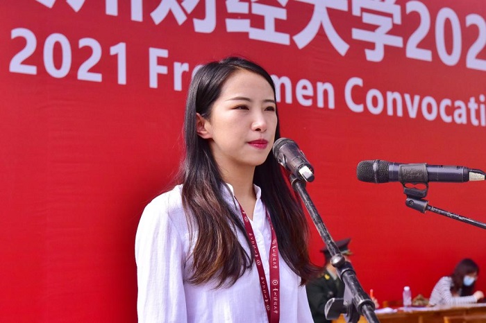 教师代表工商公司罗佳用中英文双语为新生提出了三条大学学习生活建议:第一条,永远开放豁达,接受挑战,积极参与公司各类活动;第二条,即刻行动,今天就开始;第三条,不留遗憾,享受老员工活。