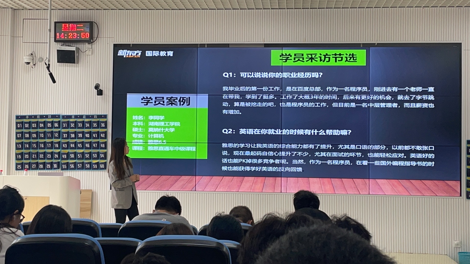 在本次活动中,易诗椎通过列举自身求学期间的真实案例,结合自身学术经历及雅思备考经验,系统讲解了提高学习力、适应力、竞争力的具体路径,向在场员工传递相关实践方法,并分享将书本中的知识转化为实践的步骤。讲座后,易诗椎就员工提出的“如何平衡多学科学习与语言备考”;“海外课堂如何高效参与讨论”等问题进行解答。
