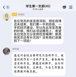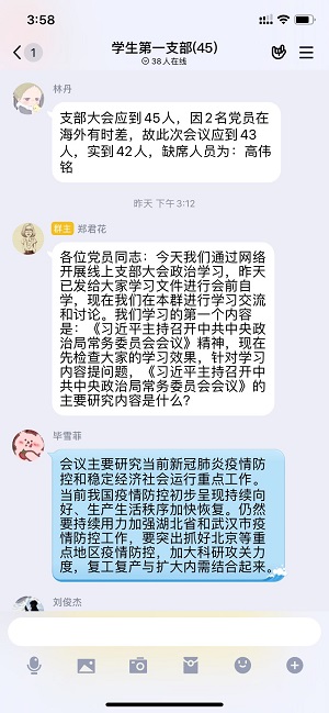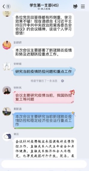 (yl23411 郑君花 图文报道)疫情当前,为抓好党员日常管理教育,严格落实“三会一课”制度,保障疫情期间学习不断,同时为加强支部教师及员工党员在特殊事情对党理论知识的学习和对疫情局势的把控,yl23411员工第一党支部于3月10日召开第二次网络支部大会,会议由支部书记郑君花主持,主要学习《习近平主持召开中共中央政治局常务委员会会议》精神、《2020年贵州省政府工作报告(全文)》、《网络信息内容生态治理规定》。本次会议是在会前个人自学的基础上进行网络上的集中交流讨论。会议过程中通过提问形式检查大家的学习效果、交流发言的形式进行讨论,最后支部书记进行总结。 会议进程第一项:郑君花对本次网络大会参会人数进行统计,并主持此次会议。
