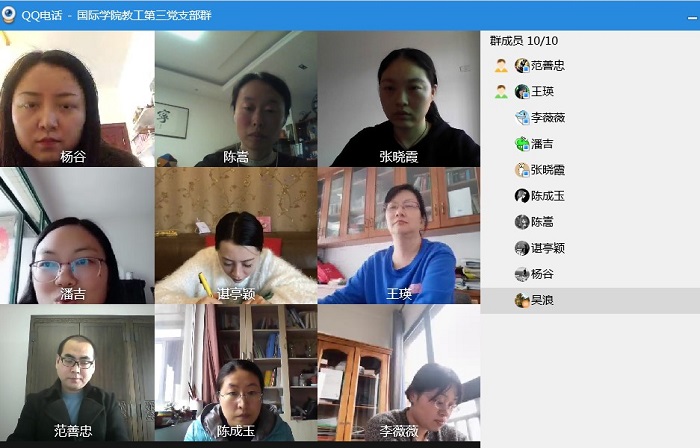 (yl23411 吴浪 图文报道)4月9日下午,教工第三党支部通过QQ视频会议开展2020年4月主题党日,支部全体党员参加,会议由党支部书记王瑛主持。