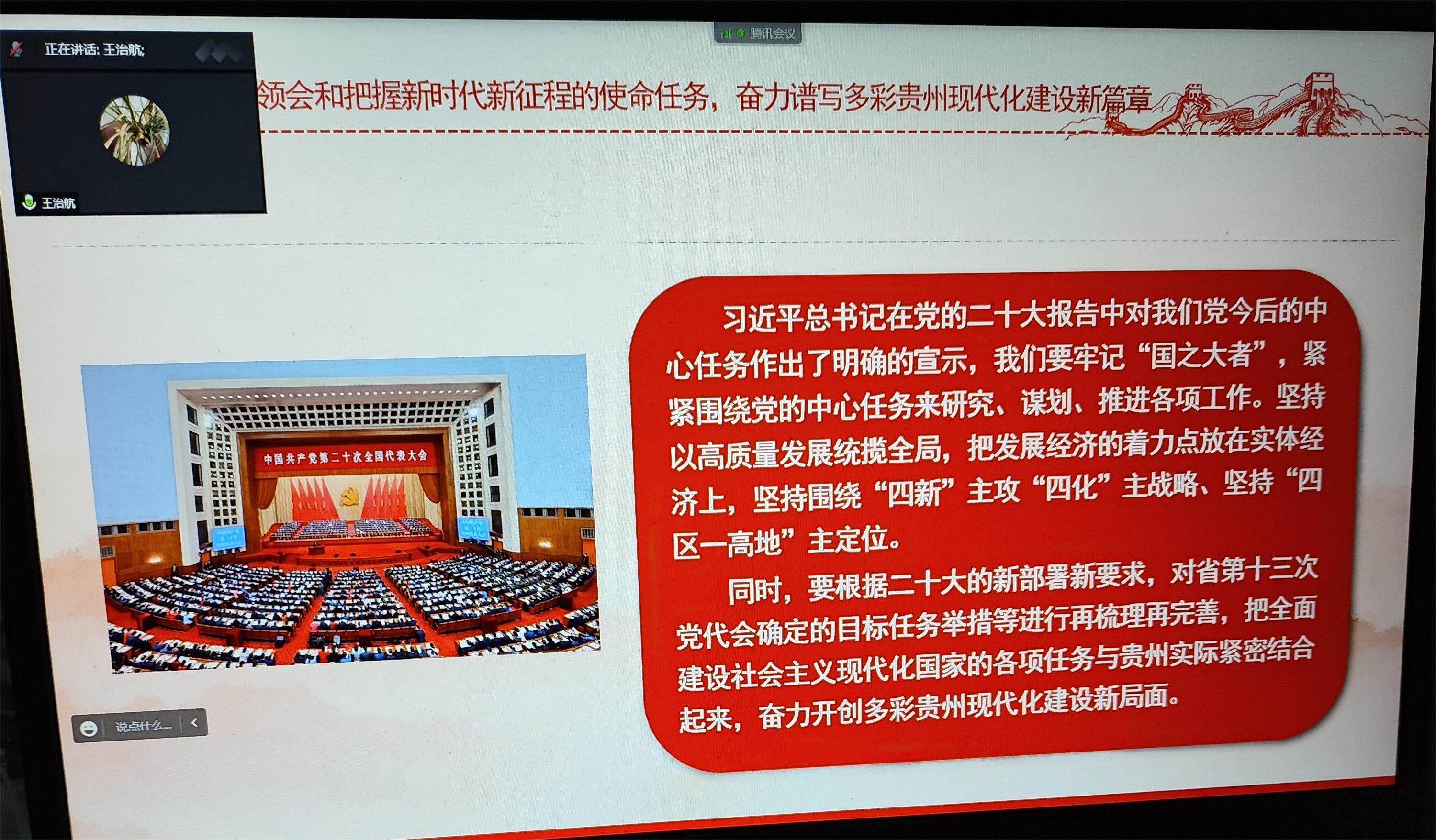 (yl23411 潘吉 图文报道)2023年1月13日上午,贵州省教育系统“百千万”人宣讲团成员、yl23411党委书记王治航线上为其所在的yl23411教工党支部宣讲党的二十大精神。宣讲主题为“深入学习贯彻党的二十大精神 高举中国特色社会主义伟大旗帜,为全面建设社会主义现代化国家而团结奋斗”,yl23411教工党支部全体成员参加。