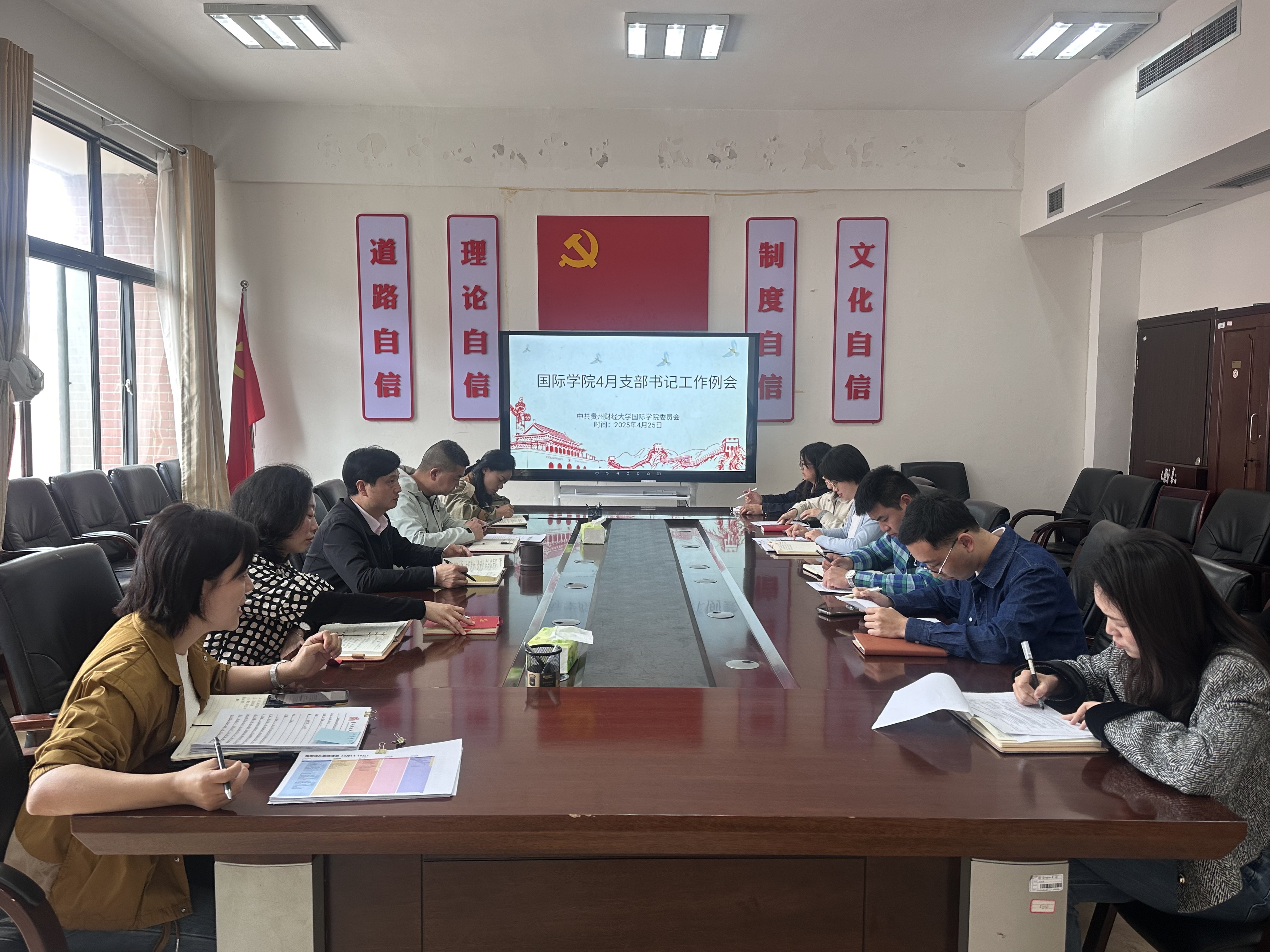李欣灿、谢凝云就近期要开展的2025届毕业生党组织关系转接及入党材料的交叉检查和移交、发展党员、深入学习习近平总书记在贵州考察时的重要讲话精神宣讲、落实深入贯彻中央八项规定精神学习教育等相关工作进行安排部署。